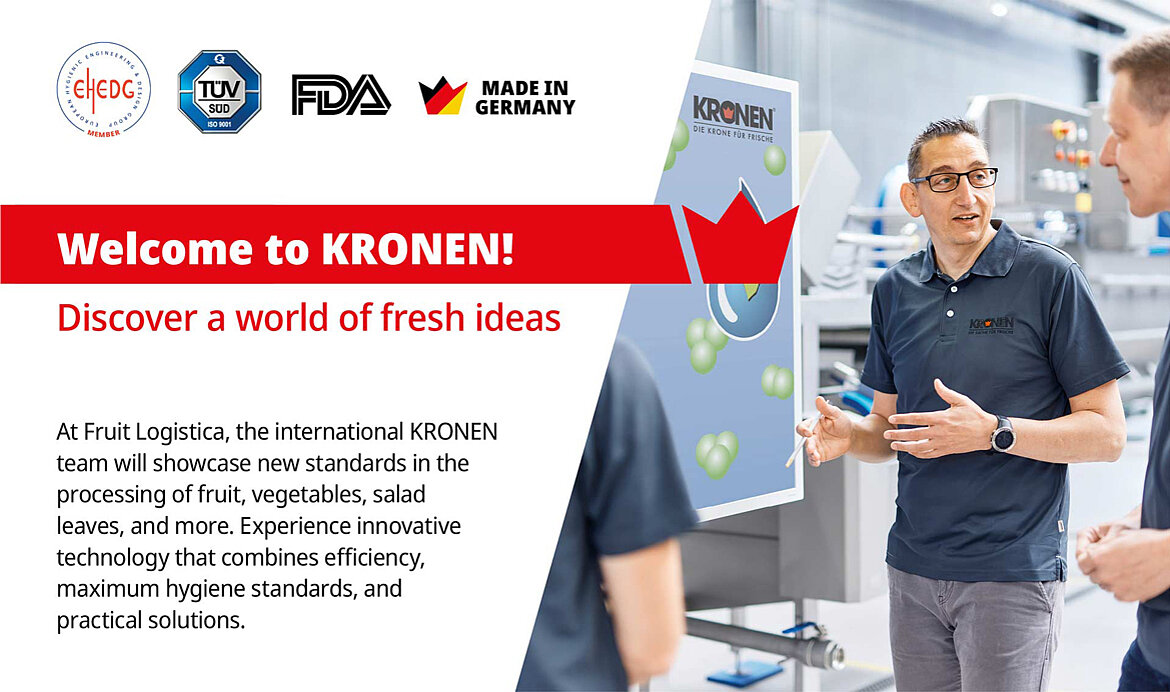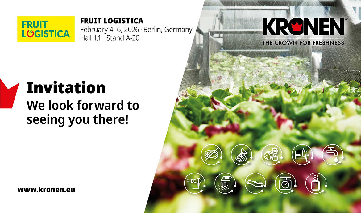 From February 4 to 6, 2026, KRONEN is presenting innovative, efficient solutions for fresh food processing at the Fruit Logistica trade show in Berlin. Come and visit us at stand A-20 in Hall 1.1!