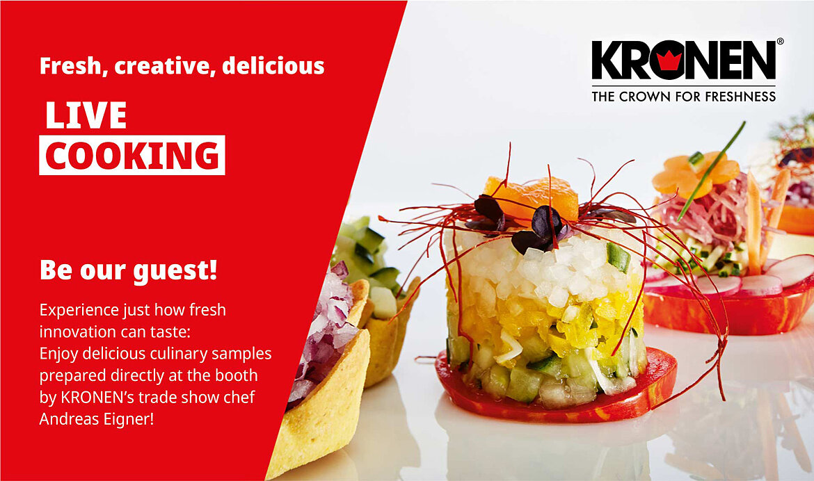 As is usual at KRONEN exhibition stands, the machines will be demonstrated live and in full product-processing operation. Small samples of culinary delicacies made by KRONEN’s trade show chef will add the perfect finishing touch for visitors to the stand.