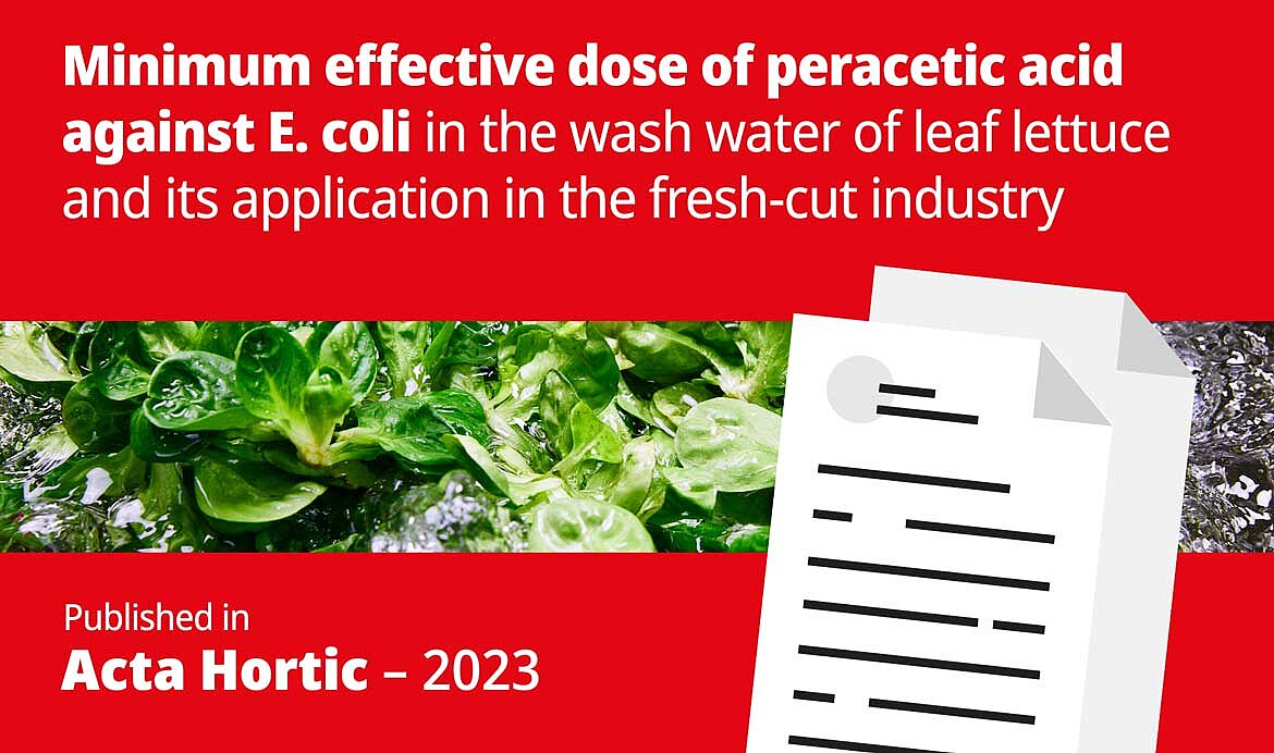 This study shows that peracetic acid (PAA) is an effective and sustainable alternative to chlorine for the hygienic cleaning of fresh-cut products. A dose of 35 ppm PPA reliably deactivates E.coli, even when there is a high chemical oxygen demand (COD) in the wash water. In the study, the effectiveness of peracetic acid disinfection was comparable to that of chlorine. Unlike chlorine, however, the use of PAA led to no significant amounts of chlorinated disinfection by-products (DBP) in the process water, while the chlorine hygienization resulted in a high concentration of hazardous by-products