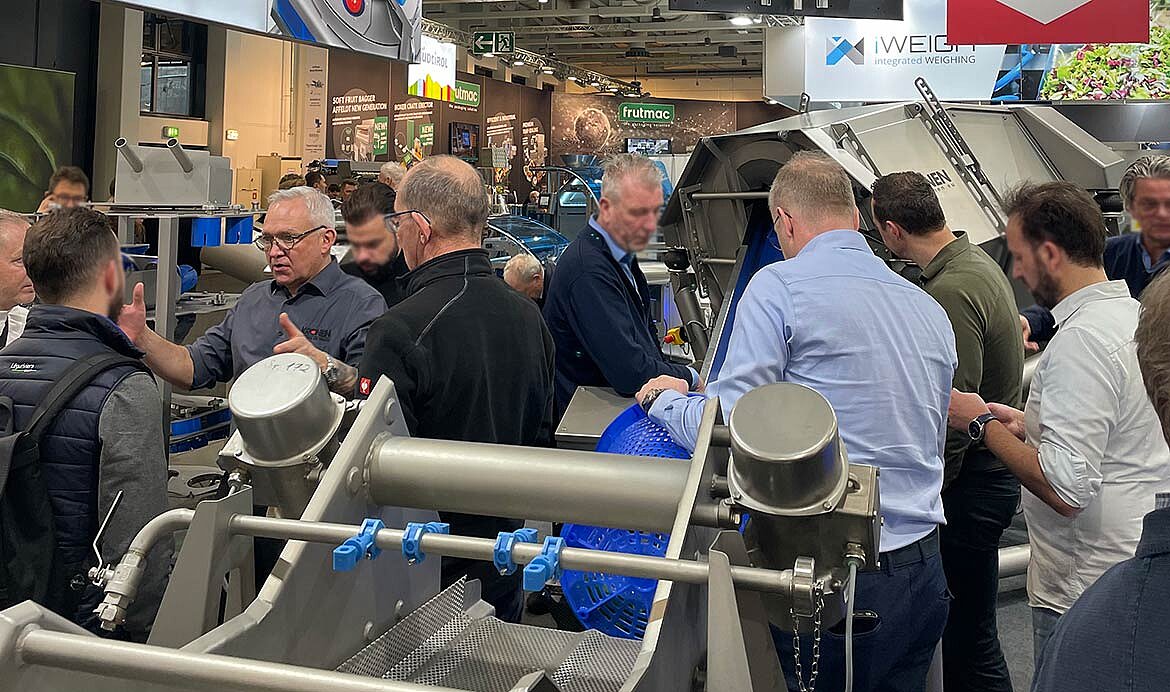 Lo más destacado del stand fue el estreno mundial del nuevo sistema de secado K1040H. La centrífuga horizontal ha sido especialmente diseñada para integrarse en líneas de procesamiento continuo de capacidad media y permite un deshidratado eficiente, higiénico y cuidadoso del producto de hasta 1,5 t/h.