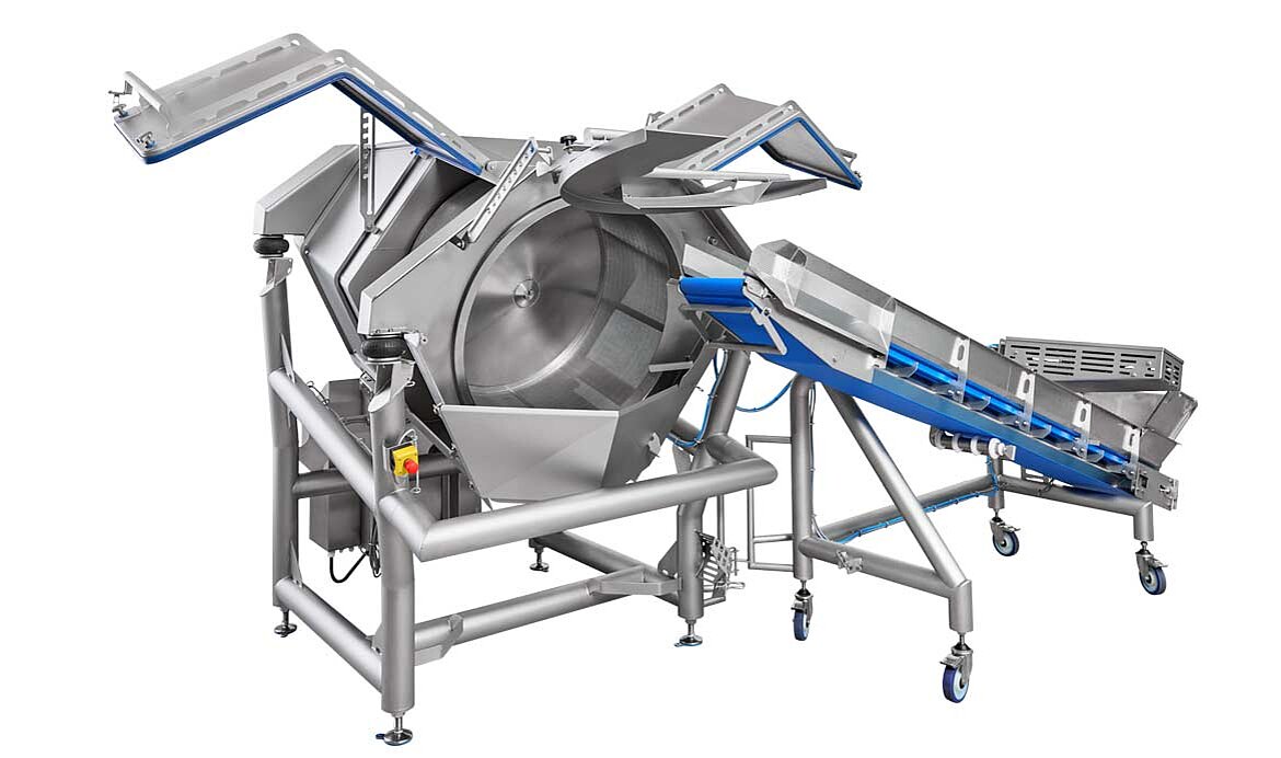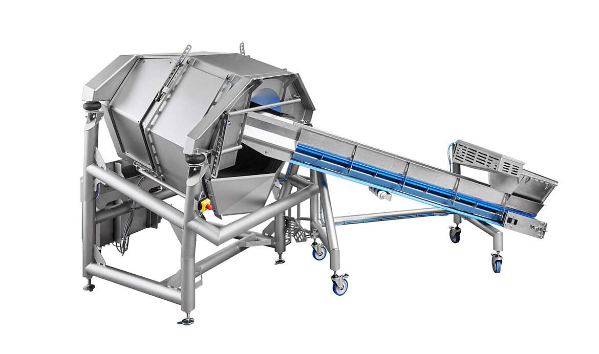 Le système compact trouve sa place en aval des laveurs, comme le HEWA 3800, et atteint, selon le produit, un taux d’humidité résiduelle de 2 à 4 %. La conception hygiénique ouverte facilite l’accès et le nettoyage des zones en contact avec le produit.